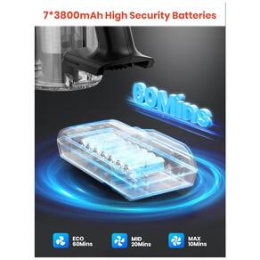 Bateria recarregável de 7 células 3800mAh oferece até 60 minutos de autonomia contínua, com recarga em 3,5 horas via dock dedicado. Estrutura portátil em formato stick com 3 cabeçotes intercambiáveis facilita adaptação a áreas de difícil acesso e limpeza versátil em ambientes internos.