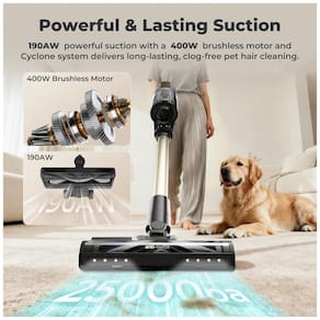 Escova V com rolos de diferentes durezas e lâminas removedoras previne emaranhados, com inclinação plana de 180° para acesso sob móveis. Filtragem HEPA de 6 estágios captura 99,97% de partículas de 0,3 mícron, com componentes removíveis (escova, filtros, copo) para manutenção simples. Estrutura 2-em-1 converte para handheld com 4 rodas para manobras suaves e suporte de carregamento.