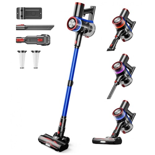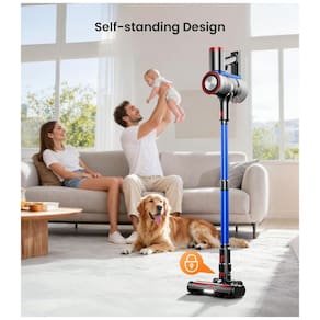 O aspirador sem fio NADALY N16 entrega sucção de 45 kPa com motor de 550 W, adequado para pisos de madeira, carpetes, azulejos e pelos de pets em uso doméstico interno. Inclui escova de piso em V anti-emaranhamento com 6 faróis LED e haste telescópica ajustável para acesso sob móveis. Design autoportante com display LED que indica bateria restante, modo de sucção e alertas de emaranhamento, com autonomia de até 65 minutos em modo mínimo e 20 minutos em modo máximo.