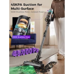 - ?Sucção potente para várias superfícies?Sucção potente de até 45 Kpa/550W, o aspirador sem fio combate facilmente poeira, detritos e pelos de animais de estimação em pisos duros, tapetes e muito mais. Transforma-se rapidamente em um aspirador portátil, com uma escova redonda integrada e uma ferramenta de fenda para limpeza versátil em casa e no seu carro