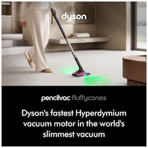 O Dyson PencilVac?? Fluffycones é um aspirador vertical sem fio projetado para limpeza em pisos duros, com cabo de 1,5 polegada (3,8 cm) que facilita o manuseio em espaços confinados e limpeza multidirecional ao redor de móveis. Sua cabeça de limpeza Fluffycones incorpora quatro rolos cilíndricos cônicos para remover fios longos sem emaranhar, combinada com lâminas de luz angular para revelar poeira invisível em pisos rígidos. Equipado com motor Hyperdymium digital girando até 140.000 rpm, oferece sucção de 50 Air Watts constante em 5 níveis de potência.