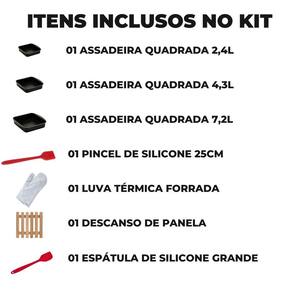 01 Assadeira N1 01 Assadeira N2 01 Assadeira N3 01 Luva Térmica de Cozinha 01 Pincel Culinário de Silicone 01 Descanso de Panela 01 Espátula de Silicone