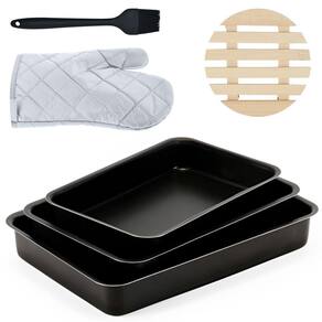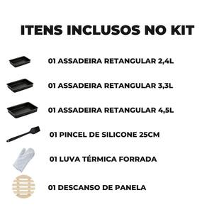 01 Assadeira N1 01 Assadeira N2 01 Assadeira N3 01 Luva Térmica de Cozinha 01 Pincel Culinário de Silicone 01 Descanso de Panela