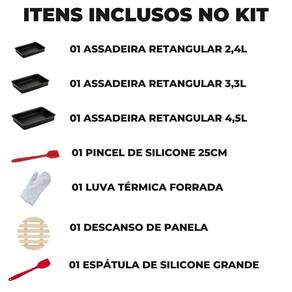 01 Assadeira N1 01 Assadeira N2 01 Assadeira N3 01 Luva Térmica de Cozinha 01 Pincel Culinário de Silicone 01 Descanso de Panela 01 Espátula de Silicone