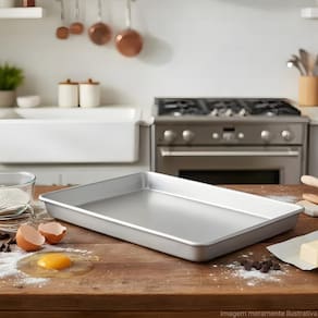 Características Técnicas: Material: Alumínio estampado Formato: Retangular Superfície: Lisa Cor: Alumínio (cinza natural) Indicação de uso: Fornos industriais e domésticos Fabricada em alumínio de alta qualidade Espessura de 0,6 mm Superfície lisa, facilitando a limpeza Leve e resistente Aplicação: Perfeita para pães doces, salgados, massas e confeitaria em geral