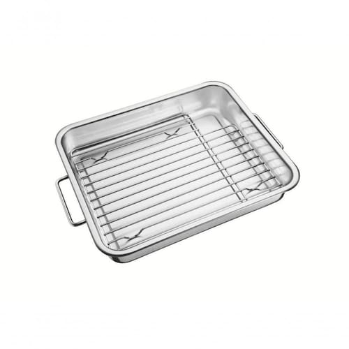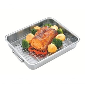 - Totalmente feita de aço inox mantêm suas características , preservando a beleza, a higiene e a durabilidade do material. - Acabamento fosco. - Possui grelha, possibilitando que a gordura fique separada do assado, garantindo cozimento uniforme e saudável. - Possui alças de aço inox que facilita o manuseio. - Pode ser lavada diariamente na máquina de lavar louças. Ean: 7891116005477