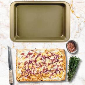 Dimensões aproximadas: 5cm x 22cm x 32cm Material: Aço Carbono Com Revestimento Antiaderente Conteúdo: 1 Assadeira Antiaderente