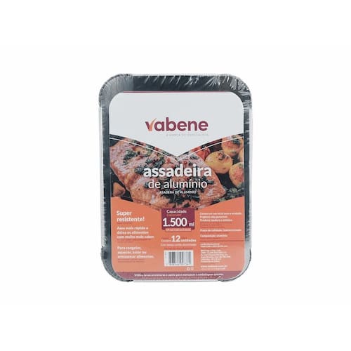 Assadeira descartável de alumínio na forma retangular, com tampa cartão aluminizado utilizada para assar e acondicionar alimentos, de espessura de 0,064 mm e capacidade de 1500ml. Sem suporte, não gravadas. Embalados em pacotes com 12 unidades Ean: 7898546007361