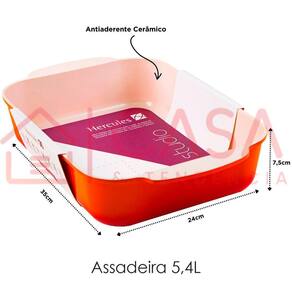 - capacidade: 5,4 litros - tamanho: 5,4 litros 35comprimento x 24largura x 7,5altura cm - corpo em alumínio fundido - antiaderente cerâmico - pintura resistente a altas temperaturas - pode ir ao forno e lava louças - pode ir ao fogão convencional e fogão halogênio - contém: 1 assadeira retangular na cor laranja de 5,4 litros 35x24cm. Especificações: marca: hercules; garantia: 3 meses;