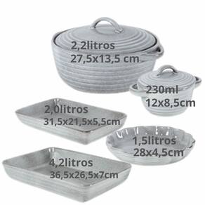 Assadeira Cinza Claro 36,5x26,5x7cm 4,2tsAssadeira Cinza Claro 31,5x21x5,5cm 2ltsAssadeira Redonda Cinza Claro D. 28,5X4,5cm 1,5ltsCaçarola Jade Cinza Claro D. 27,5x13,5cm 2,20litrosCacarolinha Jade Cinza Claro D.12x8,5cm 230mlRecomendações: