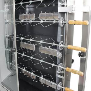 Através de um sistema eficaz de queimadores infravermelhos, o frango fica assado por igual, deixando o frango assado por igual. Por meio do isolamento térmico em lã de rocha, a temperatura se mantém alta com o mínimo de gasto de luz e gás. Graças ao seu acabamento externo em aço inox AISI 430, o equipamento tem alta resistência contra ferrugens geradas por gordura e água.