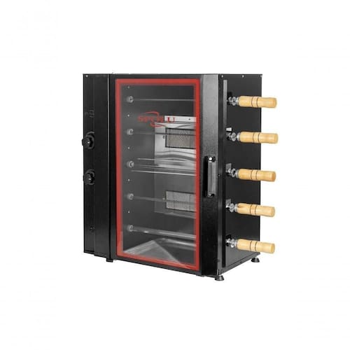 Assador a gás com 5 espetos, sistema rotativo automático, queimadores infravermelhos independentes, interior em aço inoxidável 430, porta de vidro temperado, acendimento manual.Vendido e entregue por WebContinental