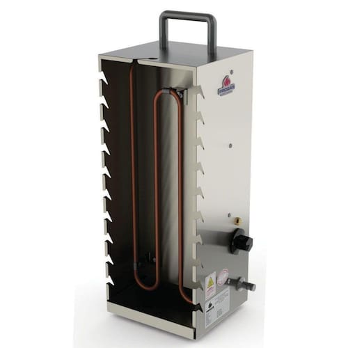 Essa Churrasqueira de Espetinhos conta com estrutura em aço inox escovado, utilizando resistência de 2000 W o que garante um perfeito assado em pouco tempo. Sua capacidade é de 10 espetinhos ou 1 espeto vertical de 75 cm, podendo ser assado qualquer tipo de espeto.