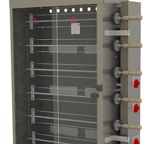 Conta com gaveta coletora de gordura que facilita o manuseio e a limpeza e rodizíos que facilitam o descolamento. Com aquecimento a gás através de queimadores infravermelhos tem capacidade de até 30 frangos.