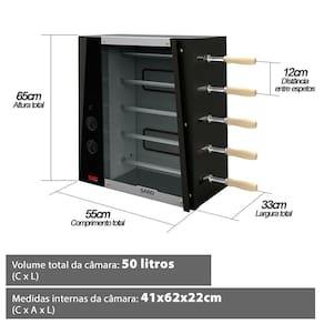 Utiliza queimadores de mega potência, assando o alimento muito mais rápido, sem contar que a carne fica ainda mais suculenta e macia do que o normal. Também tem a maior câmara interna, seu assado não pegará nas laterais da câmara, podendo assar até 7,5kg de carne por vez, atendendo um churrasco de até 15 pessoas com elegância.