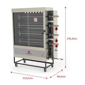 - Capacidade para 5 frangos inteiros de no máximo 2 Kg cada por espeto