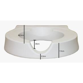 Produto: elevador de assento sanitário Marca: Alo Ortopédico Composição: polietileno branco 00B55 Medidas do produto: 43cm comprimento, 40cm de largura e 7,5cm de altura Medidas pacote: 50cm X 45cm X 9cm. Peso do produto: 1.1 kilos Suporta até 120 kilos Parafusos acompanham o item.
