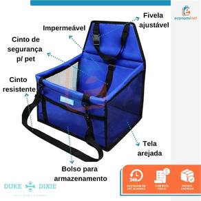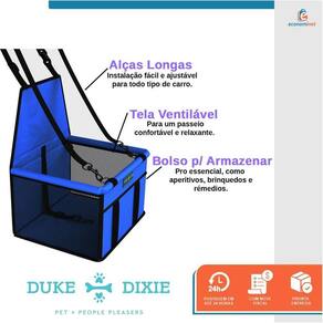 O assento para carro da Duke e Dixie é ideal para passeios, além de oferecer conforto e segurança para o seu pet. Produzido de acordo com as normas de trânsito para transportar animais em veículos, é adaptável com a maioria dos assentos dos automóveis que tenham encosto de cabeça.