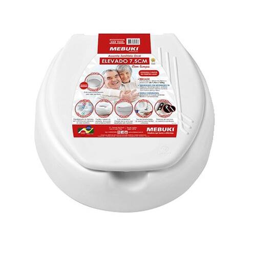 Os Assentos Sanitários Mebuki são confeccionados com matéria-prima nova, atóxica e de procedência, o que garante melhor acabamento e maior durabilidade.DESENVOLVIDO COM INFORMAÇÕES DE:-médico, fisioterapeutas e usuários, para proporcionar máximo conforto com menor esforço.RECOMENDAÇÕES:- Suporta até 120kg- Recomendado para pessoas com altura até 1,70m- Indicado para Pós-Cirúrgicos, Deficientes Físicos e Melhor Idade, por facilitar a utilização do vaso sanitário, Sem Muito Esforço Físico.DIFRENCIAIS:- Fácil Instalação: Instalação permite o uso imediato.- Economia: Evite o custo com alvenaria (mão de obra e materiais).- Inovação Mebuki: Aba de contenção- Fechamento frontal- Fácil de limpar- Reforços metálicos- Padrão ABNTCARACTERÍSTICAS PRINCIPAIS:- Fechamento Frontal: A parte frontal fechada, transmite mais segurança e impede que o paciente fique com as pernas presas, provocando quedas e graves consequências e impede que tenha urina espalhada pelo banheiro.- Reforços Metálicos: Em inox, nas partes da fixação do assento (não rasgam) e nos parafusos de nylon, garantem a mais segura fixação. Adaptável em cadeira de rodas para banho.- Higiêncio: Fácil para limpar.- Levantamento Total: Permite o levantamento total do assento, mesmo com caixa acoplada.- Segurança: Não desliza sobre a louça em função dos anéis de vedação do sistema de fixação;INSTRUÇÕES DE LIMPEZA:Utilizar somente pano macio umedecido com sabão neutro. Não utilize produtos químicos ou esponjas abrasivas, pois danificam o produto.CARACTERÍSTICAS- Altura do Assento: 7,5cm- Assento: 44cm x 39cm x 7,5cm- Indicado para Vasos Sanitários Modelos Ovais- Formato: Oval- Tipo de Material: Polietileno- Peso do Produto: 1,2 Kg- Tipo de Material da Fixação: NylonACOMPANHA:- Assento Sanitário Especial Elevado Almofadado 7,5cm Branco Mebuki- Peças de Instalação