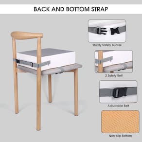 ?Ajustável e antiderrapante?: A cadeira infantil para mesa de jantar tem duas alças de segurança ajustáveis, que podem ser bem fixadas na parte de trás e na parte inferior das cadeiras, e o design antiderrapante na parte inferior da almofada do assento garante que a almofada do assento não escorregue. A cadeira elevatória infantil para mesa oferece proteção dupla para seu bebê enquanto come