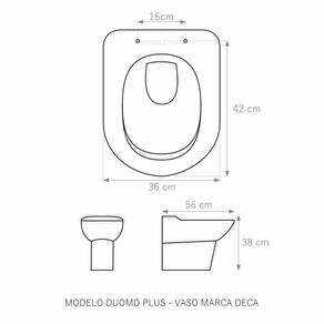 Assento Sanitário tampa de vaso fabricado em madeira MDF com pintura laqueada, com proteção raios UV, que garante excelente acabamento e durabilidade. Compatível com vasos bacias/louças sanitários com ou sem caixa acoplada. Tem calços de PVC instalados na tampa e no assento para proporcionar estabilidade ao uso, pois distribui o peso uniformemente sobre a louça sanitária. Montagem simples e fácil. Possui ferragem em alumínio anodizado que não enferruja/oxida e oferece muita resistência. O assento é acompanhado por parafusos para instalação. Embalagem dupla reforçada garante o recebimento do produto totalmente protegido. Especificações: - Dimensões da caixa: largura: 49,50cm. Altura: 4,00cm comprimento: 39,50cm - Peso do produto: 1,98kg - Acabamento: brilhante - Uso: este assento é adequado para uso na louça Deca modelo Duomo Plus - Garantia: 3 meses - Itens inclusos: Tampa e assento em MDF com calços de PVC, ferragem inoxidável, embalagem duplamente reforçada. Contém todos os parafusos e encaixes para instalação, sendo necessária somente uma chave de fenda para instalar o produto na louça sanitária. Instalação: posicione o produto, devidamente centralizado, em cima do vaso sanitário. Sem desmontar a ferragem, insira as buchas de borracha dentro dos furos da bacia sanitária. Encaixe os parafusos e posicione as porcas. Utilizando uma chave de fenda, aperte o parafuso no sentido horário até que o assento esteja firme e fixo no vaso. Manutenção: recomendamos a limpeza periódica com pano levemente umedecido com sabão neutro. Não usar esponjas abrasivas ou palha de aço nem qualquer tipo de produto químico.