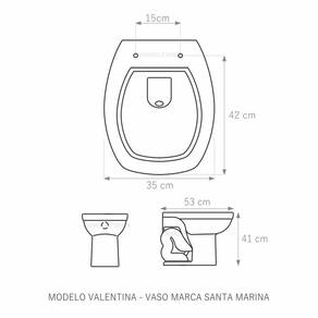 Assento Sanitário (tampa de vaso) fabricado em polipropileno. Resistente, durável, com excelente acabamento e design sofisticado. Devido a sua composição este produto é totalmente impermeável e de fácil limpeza e higienização. Compatível com vasos sanitários de descarga convencional e também vasos com caixa acoplada. Acabamento brilhante no tampo e no assento. Fixação regulável para o perfeito encaixe na louça sanitária. Fácil limpeza, é higiênico e não acumula sujeira. O assento é acompanhado por parafusos para instalação e acabamentos. Embalagem dupla reforçada garante o recebimento do produto totalmente protegido. Especificações: - Dimensões da caixa: largura: 50,00cm. Altura: 4,00cm comprimento: 40,00cm - Acabamento: brilhante - Uso: este assento é adequado para uso na louça Santamarina modelo Valentina - Garantia: 3 meses - Itens inclusos: Tampa e assento, parafusos, acabamentos e embalagem duplamente reforçada. Instalação: posicione o produto, devidamente centralizado, em cima do vaso sanitário. Encaixe os parafusos e encaixe as porcas. Aperte até que o assento esteja firme no vaso. Manutenção: recomendamos a limpeza periódica com pano levemente umedecido com sabão neutro. Não usar esponjas abrasivas ou palha de aço nem qualquer tipo de produto químico.