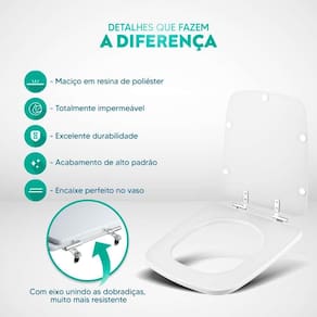 Limpeza: recomenda-se a limpeza do assento sanitário poliéster com água e sabão neutro, não utilizar produtos abrasivos.