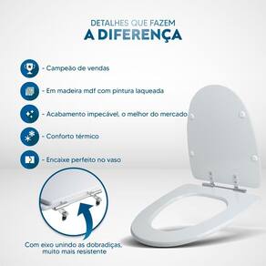 Itens inclusos: assento e tampa em madeira MDF com pintura laqueada. Ferragens metálicas em alumínio anodizado muito resistente, não oxidam e não enferrujam.