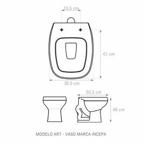 Especificações técnicas: - Dimensões da caixa: largura: 50,00cm, altura: 4,00cm, comprimento: 40,00cm - Acabamento: brilhante - Uso: adequado para uso na louça Incepa modelo Art - Garantia: 3 meses - Itens inclusos: tampa e assento, parafusos e embalagem duplamente reforçada
