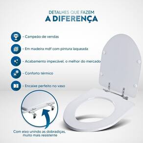 Itens inclusos: assento e tampa em madeira MDF com pintura laqueada. Ferragens metálicas em alumínio anodizado muito resistente, não oxidam e não enferrujam.