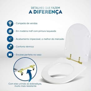 Durabilidade e Resistência: Fabricado em MDF com camadas de pintura laqueada, este assento oferece não apenas beleza, mas também conforto térmico e alta resistência. Seu acabamento impecável adiciona um toque de classe ao seu banheiro.
