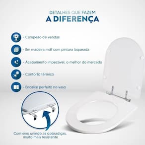 Itens inclusos: assento e tampa em madeira MDF com pintura laqueada. Ferragens metálicas em alumínio anodizado muito resistente, não oxidam e não enferrujam.