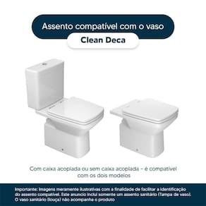 Detalhes e Cuidados Especiais: * Cor: Branco * Compatibilidade: Modelo Clean da marca Deca * Conteúdo da Embalagem: Assento sanitário, parafusos de fixação e instruções de instalação. * Fabricante do Assento Sanitário: Pontto Lavabo.