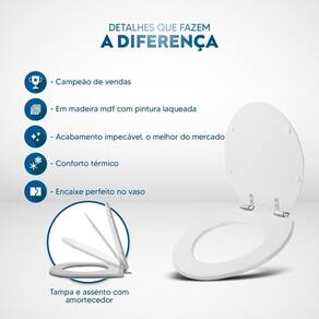 Durabilidade e Resistência: Fabricado em MDF com camadas de pintura laqueada, este assento oferece não apenas beleza, mas também conforto térmico e alta resistência. Seu acabamento impecável adiciona um toque de classe ao seu banheiro.