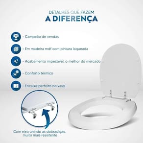 Itens inclusos: assento e tampa em madeira MDF com pintura laqueada. Ferragens metálicas em alumínio anodizado muito resistente, não oxidam e não enferrujam.