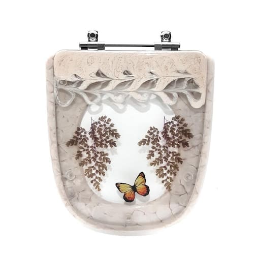 Assento Sanitário Decorado Ibiza Bege Com Borboleta Para Vaso Incepa Assento Sanitário Decorado Ibiza Bege com Borboleta Amarela e Avencas para Vaso Incepa é a escolha perfeita para seu banheiro. O Assento Sanitário Poliéster é considerado o melhor tipo de assentos sanitários do mercado pelo seu acabamento impecável e excelente durabilidade. Este assento de vaso sanitário Ibiza cor Biscuit (Bege Claro) é produzido em resina maciça de poliéster. O poliéster é uma resina semelhante ao acrílico, só que mais robusta / resistente. Por isso, é totalmente impermeável, pode ser lavado com água à vontade. Fácil de limpar. Não acumula sujeira.