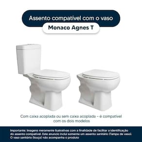 Detalhes e Cuidados Especiais: * Cor: Branco * Compatibilidade: Modelo Mônacoda marca Agnes.T* Conteúdo da Embalagem: Assento sanitário, parafusos de fixação e instruções de instalação. * Fabricante do Assento Sanitário: Pontto Lavabo (enviado na caixa conforme foto no anúncio).