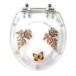 Assento Sanitário fabricado em resina virgem de Poliéster com decoração de Avenca e Borboleta inédita e exclusiva e com acabamento de superfície polido de alto brilho. Ferragem ultrarresistente e que não oxida com elevadíssimo padrão de acabamento. Possui 10 calços de PVC distribuídos na tampa e no assento, que possibilitam total estabilidade sobre a louça. Maciço em resina de Poliéster é totalmente impermeável. Com excepcional durabilidade tem design específico e diferenciado. Os produtos de poliéster com decoração podem apresentar uma eventual variação em relação as fotos apresentadas, pois tem em seu processo de fabricação uma parte puramente artesanal, o que lhes confere identidade única e absoluta originalidade. Projetado para cada modelo de louça com medidas exatas e precisas para o encaixe em seu vaso sanitário. Informações Técnicas: Principais Componentes: Tampa e Assento em Resina Virgem de Poliéster, calços de PVC para assentamento na louça, ferragem em metal inoxidável com sistema de fixação regulável, embalagem dupla reforçada. Modelo: Convencional / Oval / Universal Cor: Transparente com decoração de borboleta Uso: Para louças de formato Convencional / Oval / Universal Dimensões Caixa: 54 cm x 42 cm x 5 cm