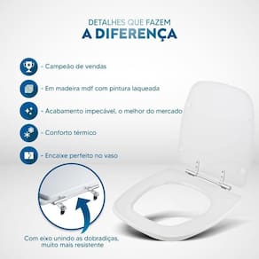 Itens inclusos: assento e tampa em madeira MDF com pintura laqueada. Ferragens metálicas em alumínio anodizado muito resistente, não oxidam e não enferrujam.