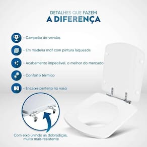 Itens inclusos: assento e tampa em madeira MDF com pintura laqueada. Ferragens metálicas em alumínio anodizado muito resistente, não oxidam e não enferrujam.