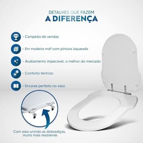 Itens inclusos: assento e tampa em madeira MDF com pintura laqueada. Ferragens metálicas em alumínio anodizado muito resistente, não oxidam e não enferrujam.