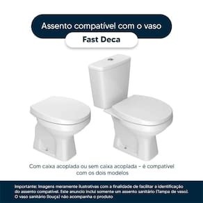 Este assento sanitário é compatível para uso em vaso sanitário Deca modelo Fast com ou sem caixa acoplada.