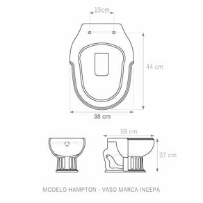 Assento Sanitário (tampa de vaso) fabricado em madeira MDF com pintura laqueada, com proteção raios UV, que garante excelente acabamento e durabilidade. Compatível com vasos (bacias/louças) sanitários com ou sem caixa acoplada. Tem calços de PVC instalados na tampa e no assento para proporcionar estabilidade ao uso, pois distribui o peso uniformemente sobre a louça sanitária. Montagem simples e fácil. Possui ferragem em alumínio anodizado que não enferruja/oxida e oferece muita resistência. O assento é acompanhado por parafusos para instalação. Embalagem dupla reforçada garante o recebimento do produto totalmente protegido. Especificações: - Dimensões da caixa: largura: 51,50cm. Altura: 4,00cm comprimento: 38,00cm - Peso do produto: 1,98kg - Acabamento: brilhante - Uso: este assento é adequado para uso na louça Incepa modelo Hampton - Garantia: 3 meses - Itens inclusos: Tampa e assento com calços de PVC, ferragem inoxidável, embalagem duplamente reforçada. Contém todos os parafusos e encaixes para instalação, sendo necessária somente uma chave de fenda para instalar o produto na louça sanitária. Instalação:posicione o produto, devidamente centralizado, em cima do vaso sanitário. Sem desmontar a ferragem, insira as buchas de borracha dentro dos furos da bacia sanitária. Utilizando uma chave de fenda, aperte o parafuso no sentido horário até que o assento esteja firme no vaso. Manutenção: recomendamos a limpeza periódica com pano levemente umedecido com sabão neutro. Não usar esponjas abrasivas ou palha de aço nem qualquer tipo de produto químico.