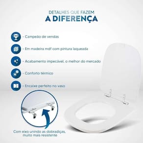 Itens inclusos: assento e tampa em madeira MDF com pintura laqueada. Ferragens metálicas em alumínio anodizado muito resistente, não oxidam e não enferrujam.