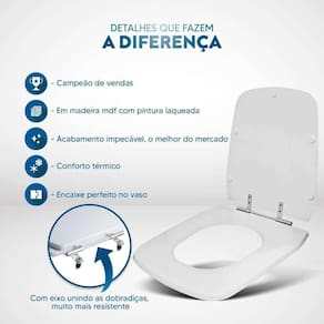 Durabilidade e Resistência: Fabricado em MDF com camadas de pintura laqueada, este assento oferece não apenas beleza, mas também conforto térmico e alta resistência. Seu acabamento impecável adiciona um toque de classe ao seu banheiro.