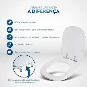 Itens inclusos: assento e tampa em madeira MDF com pintura laqueada. Ferragens metálicas em alumínio anodizado muito resistente, não oxidam e não enferrujam.