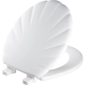 - O assento sanitário é feito de madeira moldada com design de concha e na cor branca