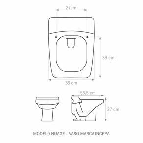 Assento Sanitário tampa de vaso fabricado em madeira MDF com pintura laqueada, com proteção raios UV, que garante excelente acabamento e durabilidade. Compatível com vasos bacias/louças sanitários com ou sem caixa acoplada. Tem calços de PVC instalados na tampa e no assento para proporcionar estabilidade ao uso, pois distribui o peso uniformemente sobre a louça sanitária. Montagem simples e fácil. Possui ferragem em alumínio anodizado que não enferruja/oxida e oferece muita resistência. O assento é acompanhado por parafusos para instalação. Embalagem dupla reforçada garante o recebimento do produto totalmente protegido. Especificações: - Dimensões da caixa: largura: 49,50cm. Altura: 4,00cm comprimento: 39,50cm - Peso do produto: 1,98kg - Acabamento: brilhante - Uso: este assento é adequado para uso na louça Incepa modelo Nuage - Garantia: 3 meses - Itens inclusos: Tampa e assento em MDF com calços de PVC, ferragem inoxidável, embalagem duplamente reforçada. Contém todos os parafusos e encaixes para instalação, sendo necessária somente uma chave de fenda para instalar o produto na louça sanitária. Instalação: posicione o produto, devidamente centralizado, em cima do vaso sanitário. Sem desmontar a ferragem, insira as buchas de borracha dentro dos furos da bacia sanitária. Encaixe os parafusos e posicione as porcas. Utilizando uma chave de fenda, aperte o parafuso no sentido horário até que o assento esteja firme e fixo no vaso. Manutenção: recomendamos a limpeza periódica com pano levemente umedecido com sabão neutro. Não usar esponjas abrasivas ou palha de aço nem qualquer tipo de produto químico.
