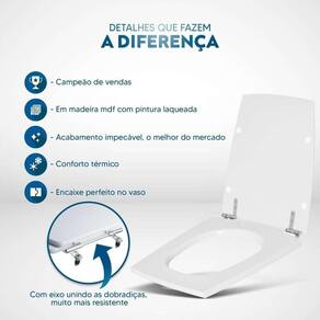 Durabilidade e Resistência: Fabricado em MDF com camadas de pintura laqueada, este assento oferece não apenas beleza, mas também conforto térmico e alta resistência. Seu acabamento impecável adiciona um toque de classe ao seu banheiro.