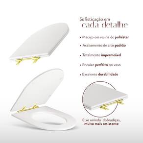 Assento Sanitário Poliéster Antibacteriano Link Lk Branco Para Vaso Deca Com Ferragem Dourada O Assento Sanitário Poliéster Luxo Link LK Branco para vaso Deca completa seu banheiro com elegância e sofisticação. Maciço em resina de poliéster, é considerado o melhor material do mercado de assentos sanitários por ser totalmente impermeável, pelo seu acabamento impecável e excelente durabilidade. Possui proteção antimicrobiana que impede o crescimento de fungos e bactérias no produto. O destaque deste produto está em seu design de linhas retas, na qualidade de seus materiais e acabamentos modernos. A ferragem é em latão cromado na cor Dourada, o mais nobre e sofisticado para assentos sanitários.